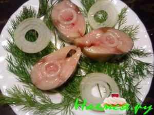 Подготовить скумбрию - отрезать ей голову и хвост и нарезать кусочками 3 см толщиной. Вынуть внутренности, промыть рыбку.