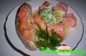 выложить на фальгу посоленные стейки сёмги,полить соком лимона и вином
