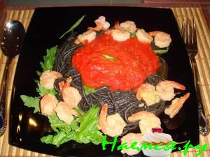 Пасту отварить откинуть на дуршлаг из пармезана сделать корзинку обжаренный перец прбить в блендаре и приготовить соус морепродукты обжарить и смешать с соусом и пастой все выложить на жаренный пармезан.