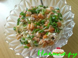 К ним добавить горошек и креветки. Укроп мелко порубить и смешать с майонезом. Этим соусом заправить салат.