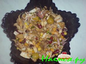 Все ингредиенты смешать и добавить пропаренный лук. Заправить салат оливковым маслом и уксусом (по вкусу).