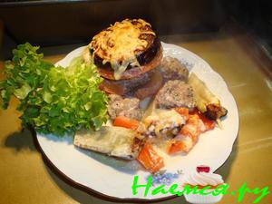 Помидорки внутри солим, перчим и закладываем внутрь салатик. На тарелку выкладываем оставшийся салат для лучшей устойчивости помидор. Украшаем петрушкой, горошком, что под рукой. Готово!