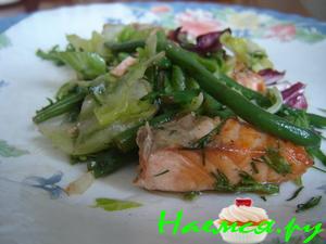 Все укладывается на порванный зеленый салат, сверху выкладывается лук (его можно перемешать со всем остальным).