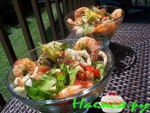 Кальмары, креветки, яйца и раковые шейки отварить.