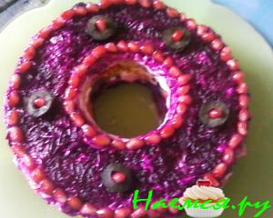 Выкладываем салат на блюдо. В центр ставим стакан и по кругу салат слоями. 1 слой: картофель, 2-й свекла, 3-й рыба, 4-й морковь, 5-й огурец, 6-й яйца, смазывая каждый слой майонезом.