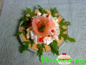 лосось размять вилкой,добавить порезанные овощи,затем горошек и кукурузу,посолить и поперчить.для пикантности добавить пару зубчиков чеснока и пару капель лимон.сока.добавить рис,отвареный в подсоленой воде.перемешать и заправить майонезом.кушайте.