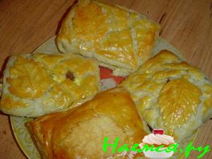 Две пластины готового теста сложить вместе и раскатать в пласт толщиной 0,2-0,3 см. Нарезать его на прямоугольники размером 6 см х 8 см.