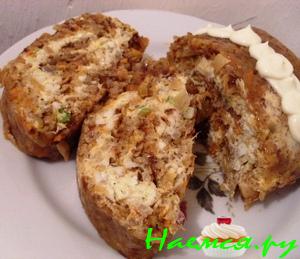 Желток смешала с майонезом (получилась консистенция кефира, если будет слишком густо - добавьте водички), обмазала расстоявшийся рулет. Сыр (можно взять любой) натерла на крупной терке, присыпала (не густо) обмазанный рулет. Выпекала на среднем уровне в духовке при 180 гр. примерно 30 минут.