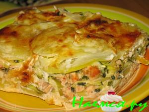 Запеканка с рыбой и грибами под сеточкой из картофельного теста
