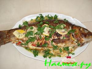 Карпа моем, чистим, потрошим, удаляем жабры. Натираем карпа морской солью. Делаем продольные надрезы, в которые вкладываем дольки лимона.