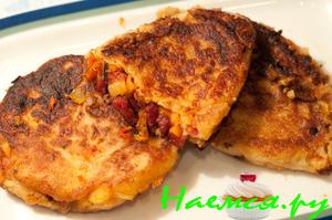 на влажной ладони формируем блинчик из пюре, укладываем внутрь фарш, формируем зразу.
