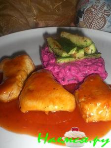 К данному блюду я предпочитаю гарнир из овощей. Перед подачей на стол, поливаем соусом.