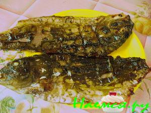 Вторая часть: Уже утро(сегодня)Рыбку вынула из маринада,очистила от лука и др. и положила в посудину.Рыбку сбрызгиваем лимоном,смазываем майонезом,заливаем сливками,посыпаем фисташками(орешки мелко порублены)и посыпаем красным перцем сладким(паприка)Духовка разогрета до 250град.ставим и запекаем 20 минут,после вынимаем и поливаем соком, посыпаем сыром,а сверху кладем кусочки сл.масла,И опять в духовку на нескл.минут на 300град.