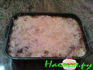 Дальше пошло интереснее: выяснилось, что в холодильнике остался маленький кусочек масла, остатки сметаны и майонеза, сыра нет вообще никакого. Пришлось довольствоваться тем, что есть. Все это уложила на картошку и отправила жаровню в предварительно разогретую до 200 гр. С духовку на 30 мин.