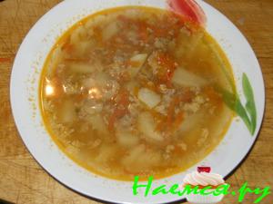 Вскипятила воду, порезала кубиками картофель, добавила в кипящий бульон