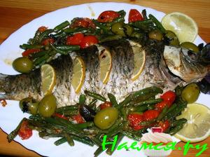 Крупного карпа чистим, моем, разделываем на крупные порционные куски.Рыбу солим,присыпаем специями,сбрызгиваем лимонным соком. Оставляем мариноваться на 1-2часа. Пока рыба маринуется чистим морковку, луковицу и небольшой клубень сельдерея.Лимон обдать кипятком, чтобы ушла горечь. Овощи нарезать тонкими пластинками, лук и лимон кольцами . Рыбу укладываем на фольгу отдельно каждый кусок. Внутрь каждого куска вкладываем слоями овощи и потом сверху тоже выкладываем слоями и посыпаем зеленью. Закрываем фольгу в виде конвертов, выкладываем на противень, в который наливаем немного воды, Ставим на час в духовку, разогретую до 220гр. За 5мин. до готовности открываем фольгу, чтобы овощи подрумянились.