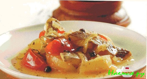 Положите следующий слой рыбы, затем оставшиеся овощи и лавровые листья.