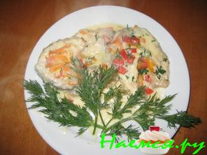 Если рыба заморожена,то предварительно ее размораживаем,режем на крупные кусочки,выкладываем в форму для запекания.Я выложила рыбу в предварительно смазанную растительным маслом