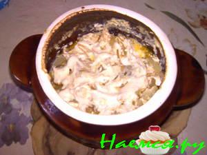 Рыбу почистить,выпотрошить,вымыть,отделить мякоть от костей и порезать ее на куски,картошку кружочками.У солёного огурца удалить кожицу и крупные семена,а остальное нарезать кубиками.Лук мелко порезать и обжарить в разогретом масле.В горшочки положить по лавровому листику,перец горошком,картошку,сверху жареный лучок,залить сливками и водичкой,посолить,поперчить и тушить до мягкости.