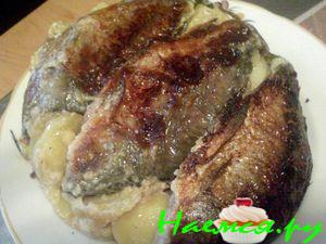 Жаренных карасей выложить в форму для запекания,я складывала ее в утятницу,обложить рыбу кольцами жареного лука и залить сметаной,поставить в духовку на мин.20