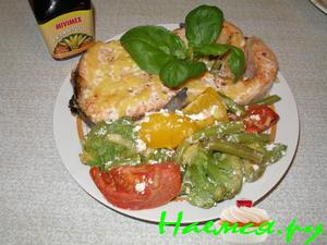 1 Стейки семги разложить на противне и посыпать сушеным базиликом. На один среднего размера стейк уйдет примерно 1/2 ч.л. травы