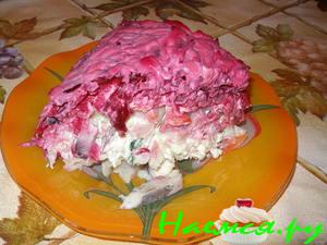 Шубу готовим, как в оригинале кроме- филе сельди, заменяем его слабосолёным филе скумбрии замаринованной вместе с подсолнечным маслом и луком. Филе и лук промокнуть полотенцем-это нижний слой, потом картофель, морковь, свекла, только слои делаем очень тонкие и повторяем их поочерёдно 2 раза.