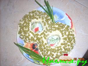 Отделить белки от желтков. Белки мелко порезать и смешать с майонезом, желтки натереть на терке.