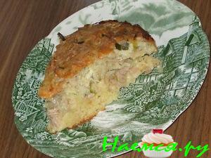 Половину теста вылить в смазанную форму,выложить начинку и залить оставшимся тестом.