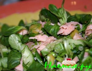 здесь салат с угрем, он у нас очень дорогой,наверно будет неплохо в салате стерлядь, а вообще можно пожарить филе например судака добавив на сковороду жидкий дым.