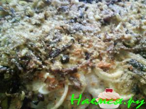 берем пангасиуса(рыба) разделываем на чистое филе. укладываем на противень, сверху смазываем майонезам, далее сверху лук пасерованый и грибы мелко резанные.