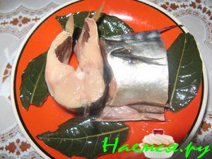 Поставить воду на огонь, добавить специи, соль и сахар, кипятить 2-3 минуты. Рассол снять с огня и остудить. Рыбу выло жить в емкость и полностью залить рассолом. Поставить в холодильник на 2-4 суток. Перед подачей порезать на кусочки.