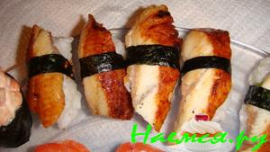 - Соус. Суши едятся с соевым соусом, в который можно добавить васаби по вкусу. Маки часто поливаются разными соусами, такими как терияки, унаги или спайси.