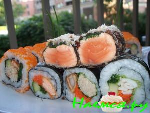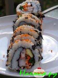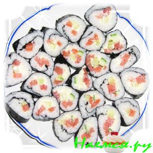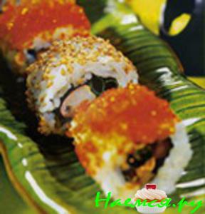 - Урамаки - это маки наизнанку, в которых рис находится снаружи, а нори - внутри. Такой способ заворачивания был придуман японскими поварами в Америке в 70-х годах для тех, кто не любил вкус нори. Урамаки часто обсыпаются кунжутом или икрой для декора. Самые известные урамаки - это Калифорния и Филадельфия.