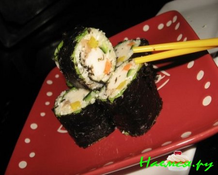 - Начинка. Вы можете использовать любые продукты, которые вам нравятся: рыбу, морепродукты, овощи, сыр, яйцо и т.д. Главное, чтобы они были свежими и качественными. Начинку нужно нарезать тонкими полосками или кубиками.