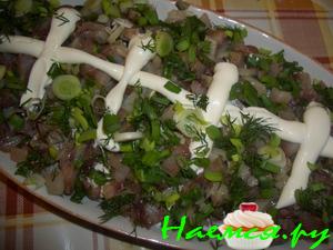 Полить подсолнечным маслом, посыпать зеленым луком и зеленью.