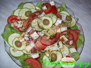 4.На листья салата выложить подготовленные овощи,грецкие орехи и заправить соусом.