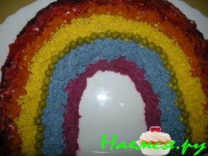 Каждый слой заправлять соусом, сверху посыпать тертым желтком.