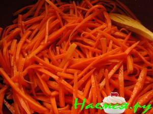 морковь нашинковать длинной соломкой,перемешать с солью,добавить уксус,мелко нарезанный чеснок.