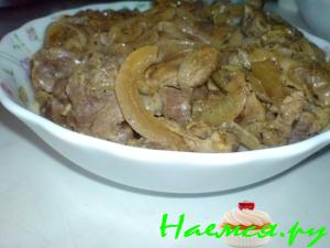 Лук порезать полукольцами.Обжарить на растительном масле лук+желудочки,посолить и поперчить чёрным перчиком.