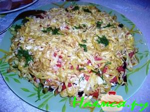 5 – хаотично разбросаная по верху салата омлетная соломка, которую перемазать майонезом.