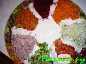 На блюдо выложить слой мяса,смазать небольшим количеством майонеза и слой огурцов,тоже смазать майонезом.