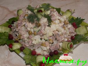 Смешать все ингредиенты и заправить майонезом с горчицей.