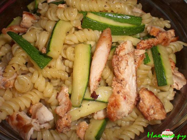 Цукини нарезать и обжарить слегка, соль, перец по вкусу. Куриное филе обжарить с двух сторон, и нарезать на пластины.