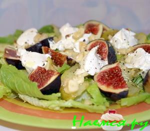 Добавить в миску с салатом инжир, орехи и раскрошеный сыр. Посыпать перцем.
