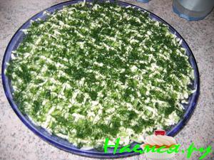 Верх посыпать оставшимся тёртым сыром,украсить половинками орехов.