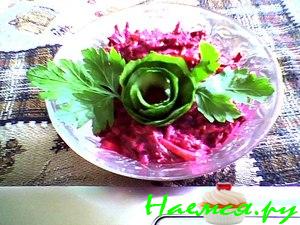 Свеклу и яйца отварить. Свеклу и сыр натереть на крупной терке.Яйца и лук нарезать.Добавить чеснок через ченокодавилку.Салатик заправить сметаной или майонезом.Посолить,можно не солить и дать пропитаться.