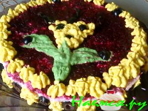 Весь верх посыпаем тёртыми желтками,даём салату пропитаться в холодильнике 2-3часа.