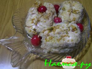 Сверху выложить кусочки фруктов и посыпать орешками.
