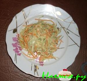 Овощи тщательно моем и снимаем шкурку :), трём всё ( и чеснок)на мелкой тёрке (на крупной - салат получается жестковатым), заправляем майонезом.