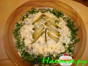 добавить зеленый горошек,поперчить на вкус и заправить майонезом или сметаной